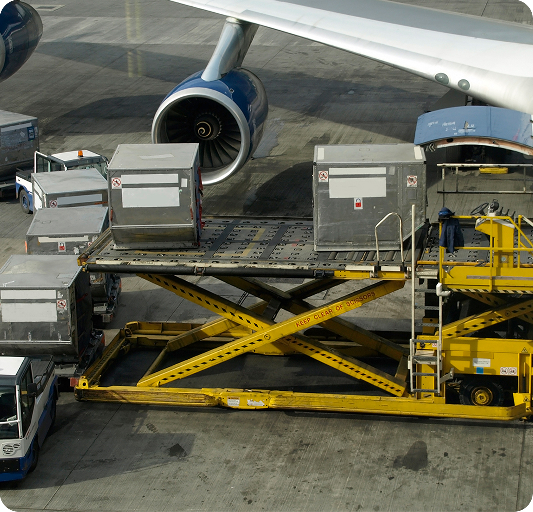 Вид на грузовые контейнеры, размещенные на платформе возле самолета, с турбинами Boeing на заднем плане.